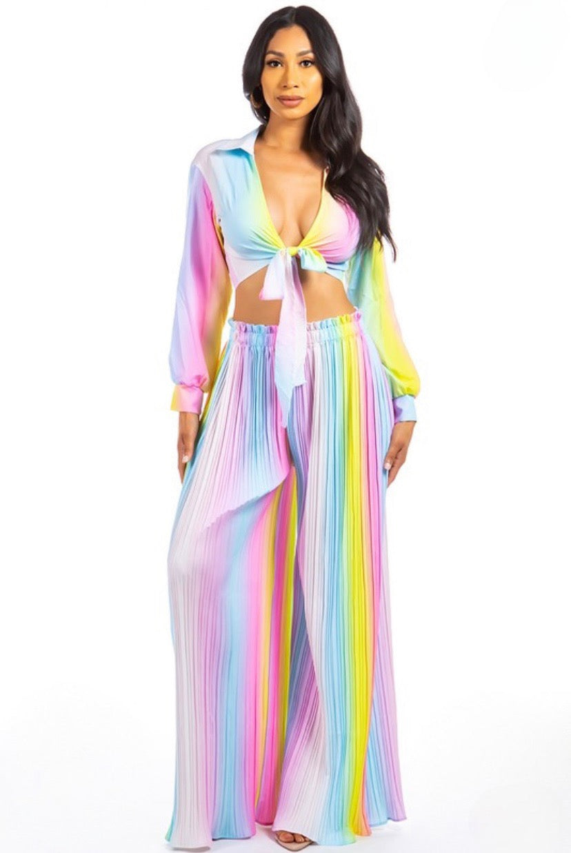 Brighten up your world with the Vibrant Rainbow Row set - perfect for fashion-forward women who loves colors and making a statement. Wear the long-sleeve collared crop top with a plunging neckline and wide leg accordion pleated pants. Wear together or separately for endless style possibilities.